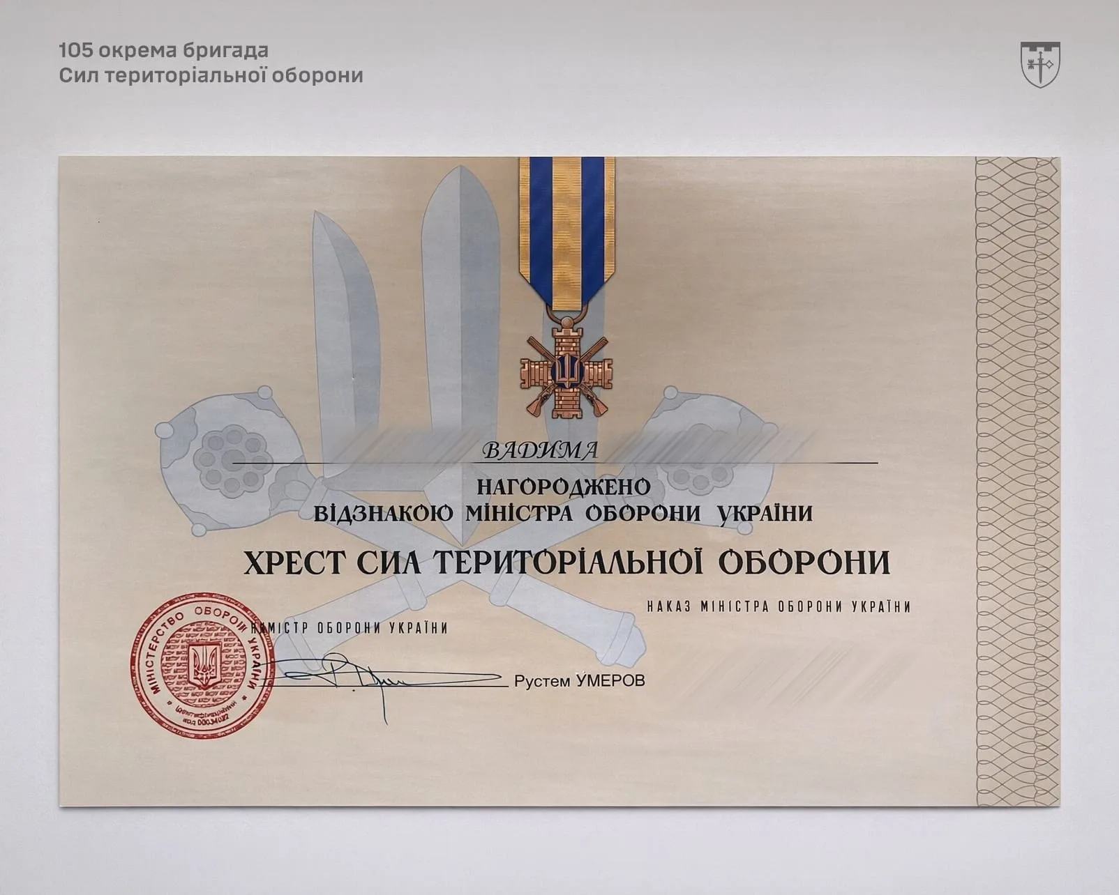 За час служби у складі 105-ї окремої бригади ТрО Вадим отримав чимало відзнак, серед яких: «Хрест Сил територіальної оборони», «Золотий хрест», а також відзнака Президента України «За оборону України».