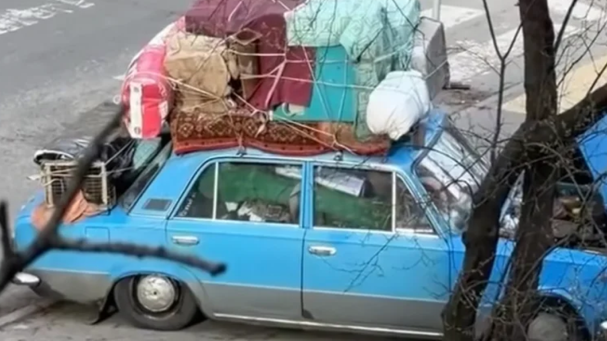 Чоловік завантажив всі свої речі на старий автомобіль ВАЗ та рушив у дорогу. В автівку він зібрав все найдорожче, що мав: речі, побутову техніку, собаку та навіть курей. Однак та не витримала далекої дороги та зламалася у Києві.