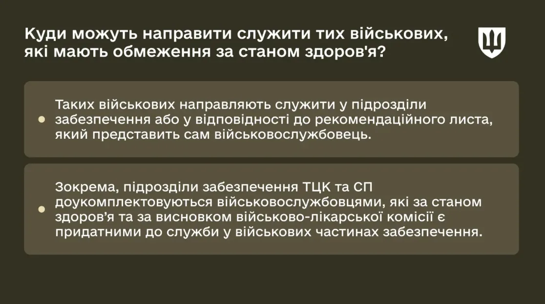 Зокрема, підрозділи забезпечення ТЦК та СП доукомплектовуються військовослужбовцями, які за станом здоров’я та за висновком військово-лікарської комісії є придатними до служби у військових частинах забезпечення.