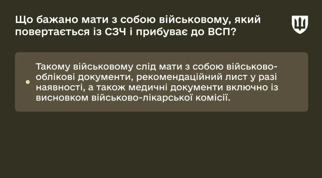 Що бажано мати з собою військовому, який повертається із СЗЧ і прибуває до ВСП?